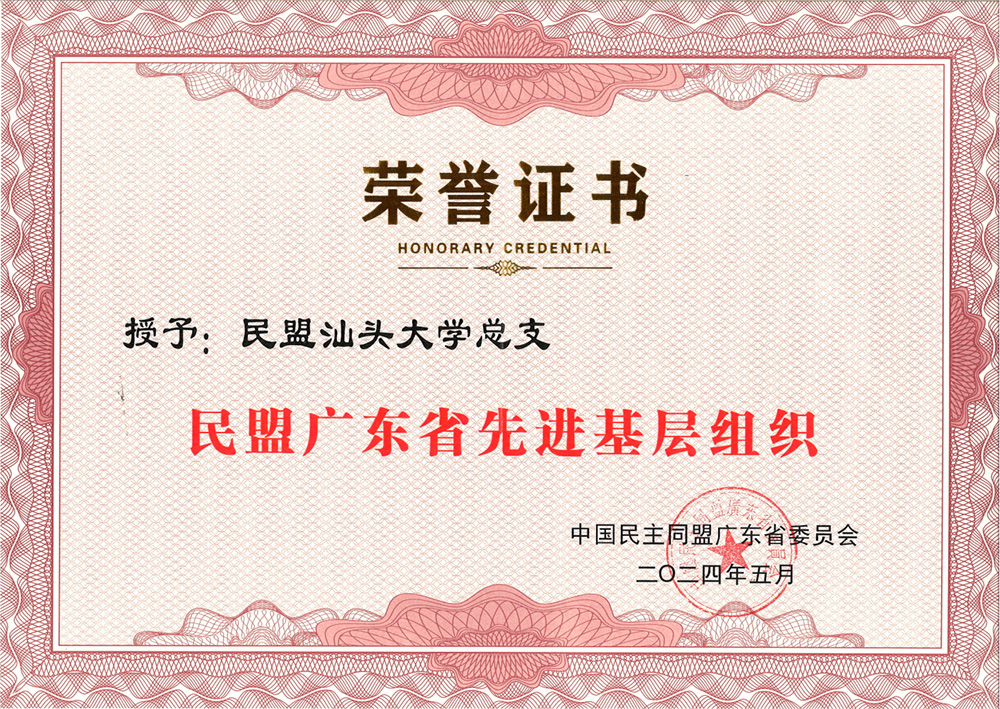 近日,民盟汕头大学总支荣获民盟广东省委会授予的“民盟广东省先进基层组织”荣誉称号。